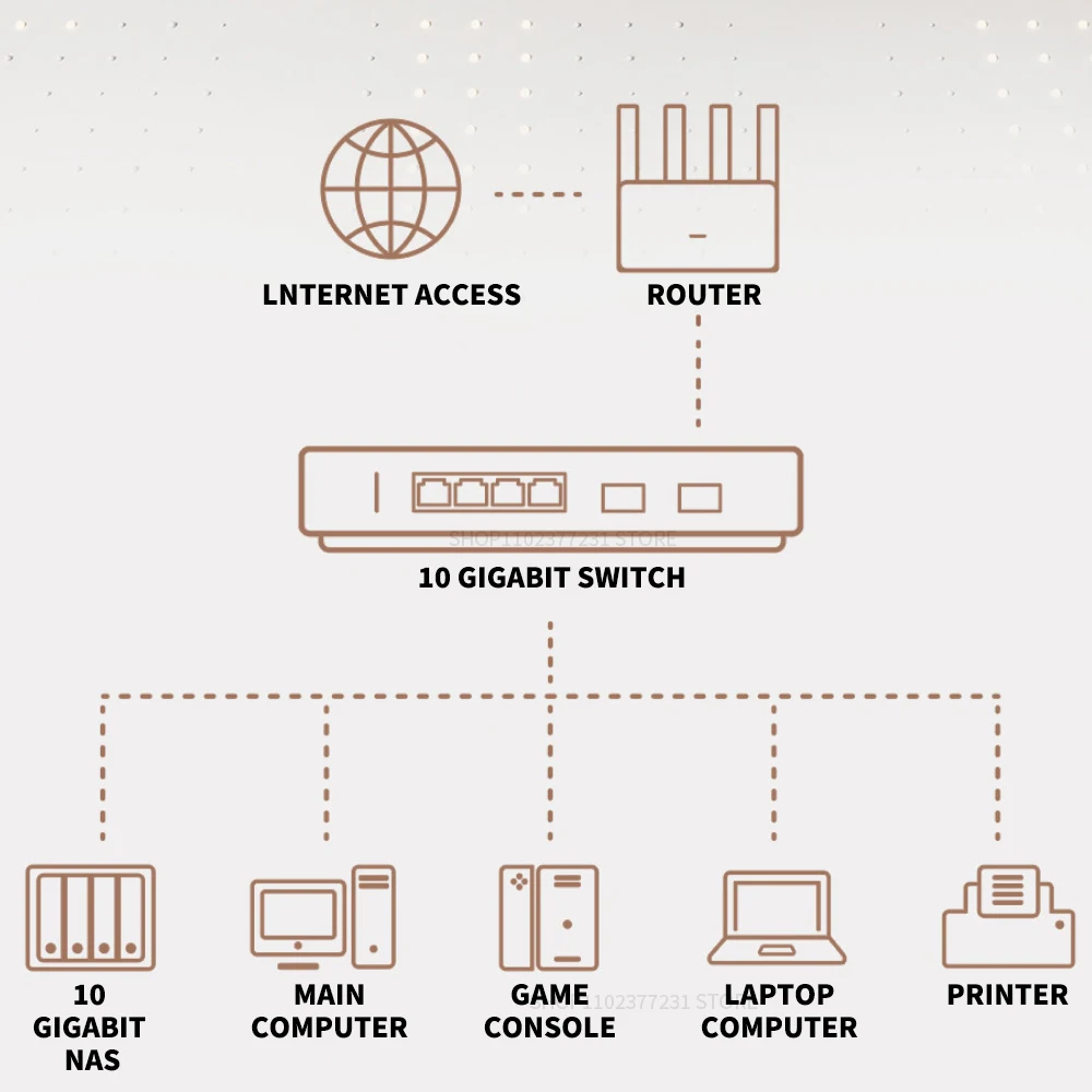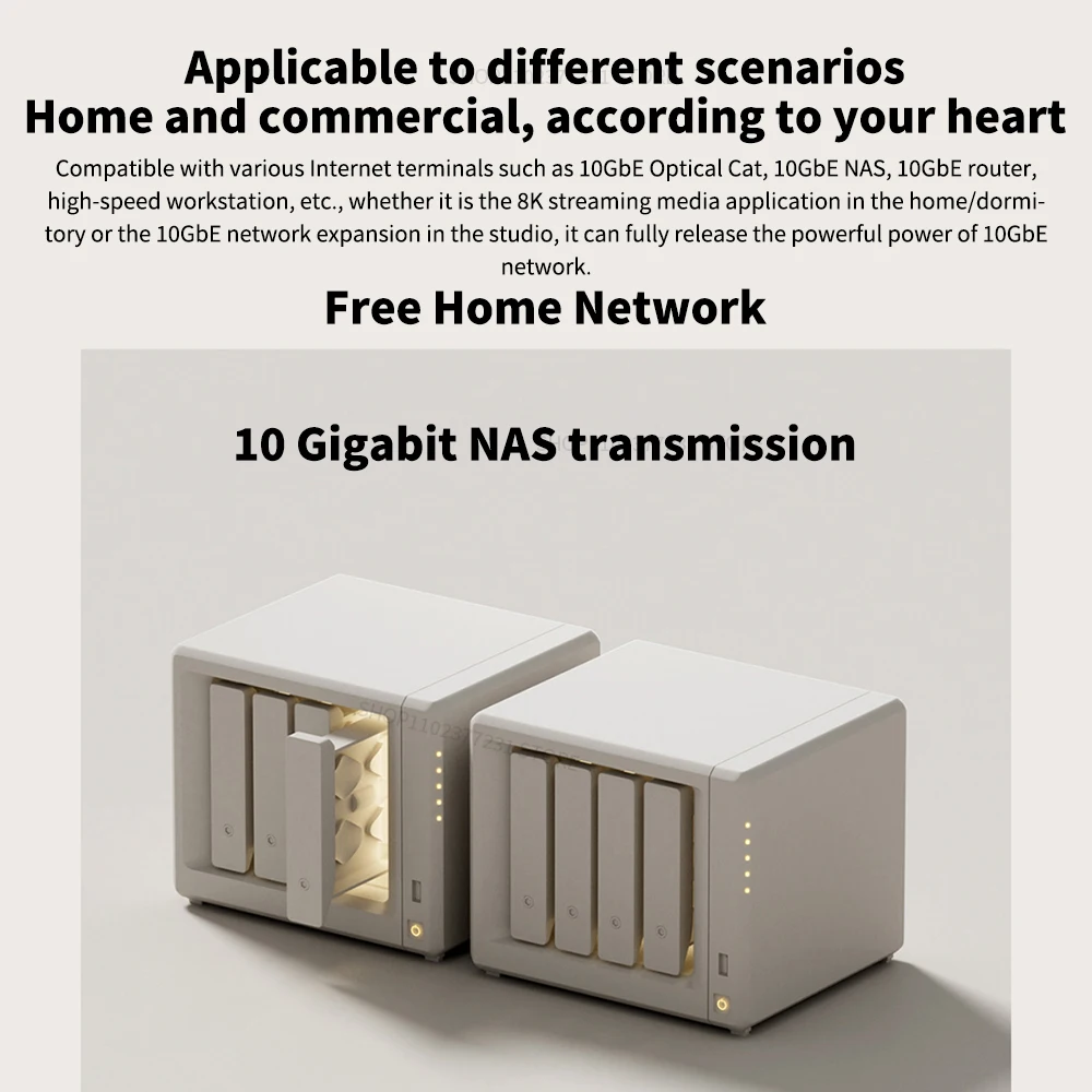Compatible with various internet terminals such as 10G Optical Cat, 10G NAS, 10G router,high-speed workstation, etc., whether it is the 8K streaming media application in the home/dormitory or the 10G network expansion in the studio, it can fully release the powerful power of 10G network.