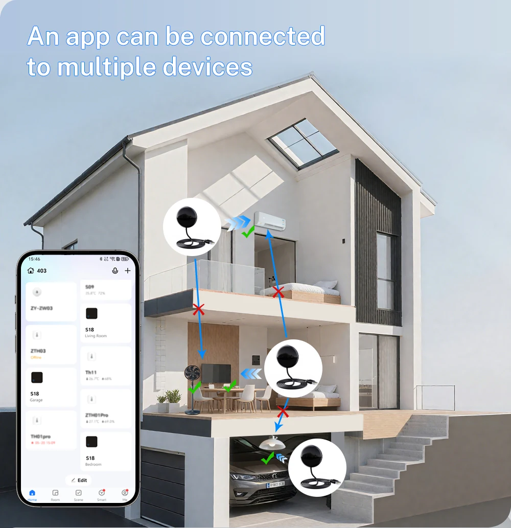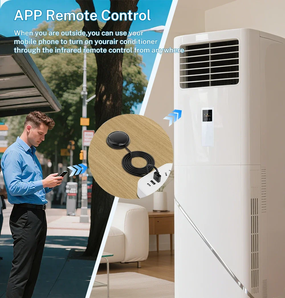 A: The farthest effective distance for Smart IR Remote infrared is 10m. But if the distance between the device and the Smart IR Remote exceeds 10m, we suggest that you install the Smart IR Remote closer, or you need to adjust the angle so that one of the transmitting tubes is facing the infrared signal receiving window of the air conditioner, and make sure there is no barrier between them.