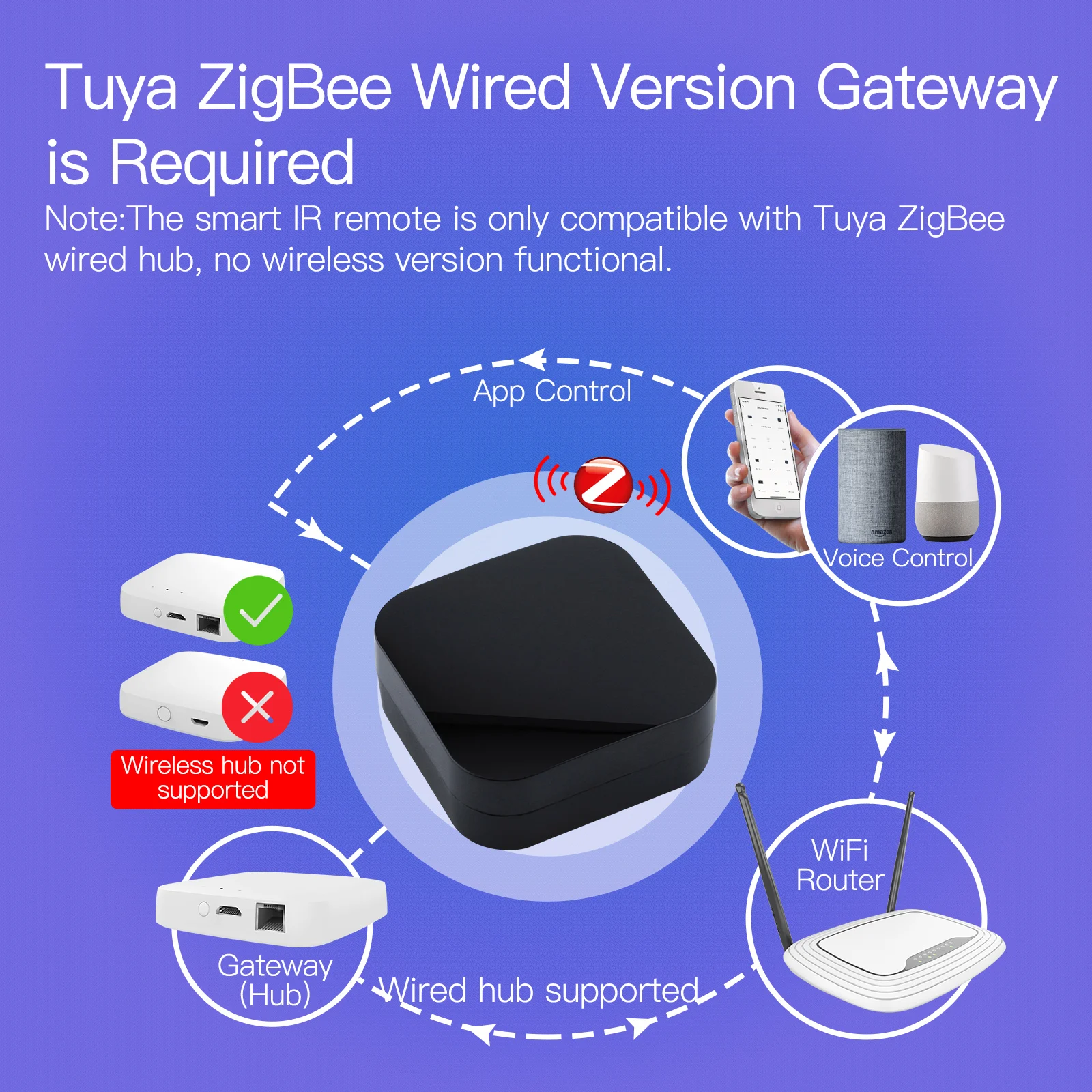 1.Tuya ZigBee Wired Gateway Required:This Tuya smart ZigBee IR remote is designed with Tuya ZigBee wired gateway required for APP configuration and smart controls in Smart Life APP.(Note:Only a wired hub is compatible with the ZigBee IR remote,the wireless hub is not supported for APP configuration.)